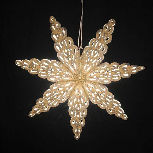 Onverlicht is deze papieren lamp al prachtig. Maar met verlichting komt deze 3-dimensonele hanglamp 's avonds helemaal tot leven. Het verschil kun je goed zien aan de foto's: met een donkere achtergrond is de ster verlicht; met witte achtergrond onverlicht.