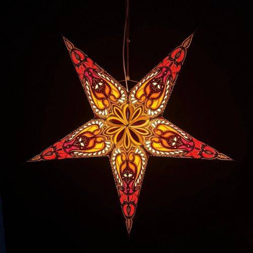 Een papieren kerstster is onmisbaar om in huis een gezellige kerstsfeer te creëren. Onverlicht is deze papieren kerstster al prachtig. Maar met verlichting komt de ster 's avonds helemaal tot leven. De kleuren en het patroon komen dan nog mooier uit.