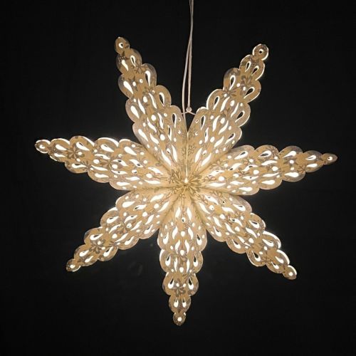 Onverlicht is deze papieren lamp al prachtig. Maar met verlichting komt deze 3-dimensonele hanglamp 's avonds helemaal tot leven. Het verschil kun je goed zien aan de foto's: met een donkere achtergrond is de ster verlicht; met witte achtergrond onverlicht.